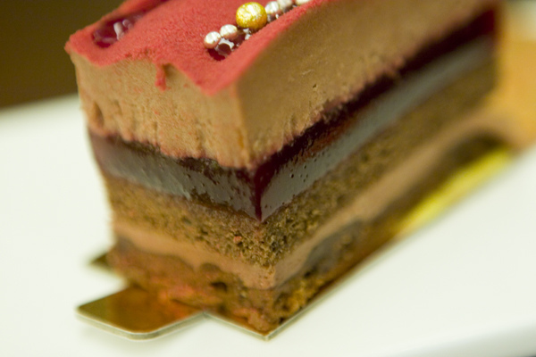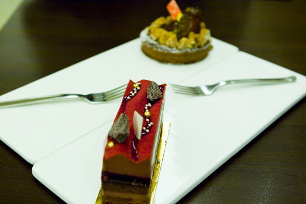 摩澤爾河谷 Valee Moselle 與一個梨,構成奇怪的標題!這其實是周日下午我享用的兩個法式糕點。摩澤爾河谷:覆盆子軟凍、史特賽勒巧克力碎片、覆盆子巧克力慕絲、巧克力久貢的;香料西洋梨塔:香料燉西洋梨、巧克力烤餡、椹果碎餅、巧克力苦甜塔皮。
